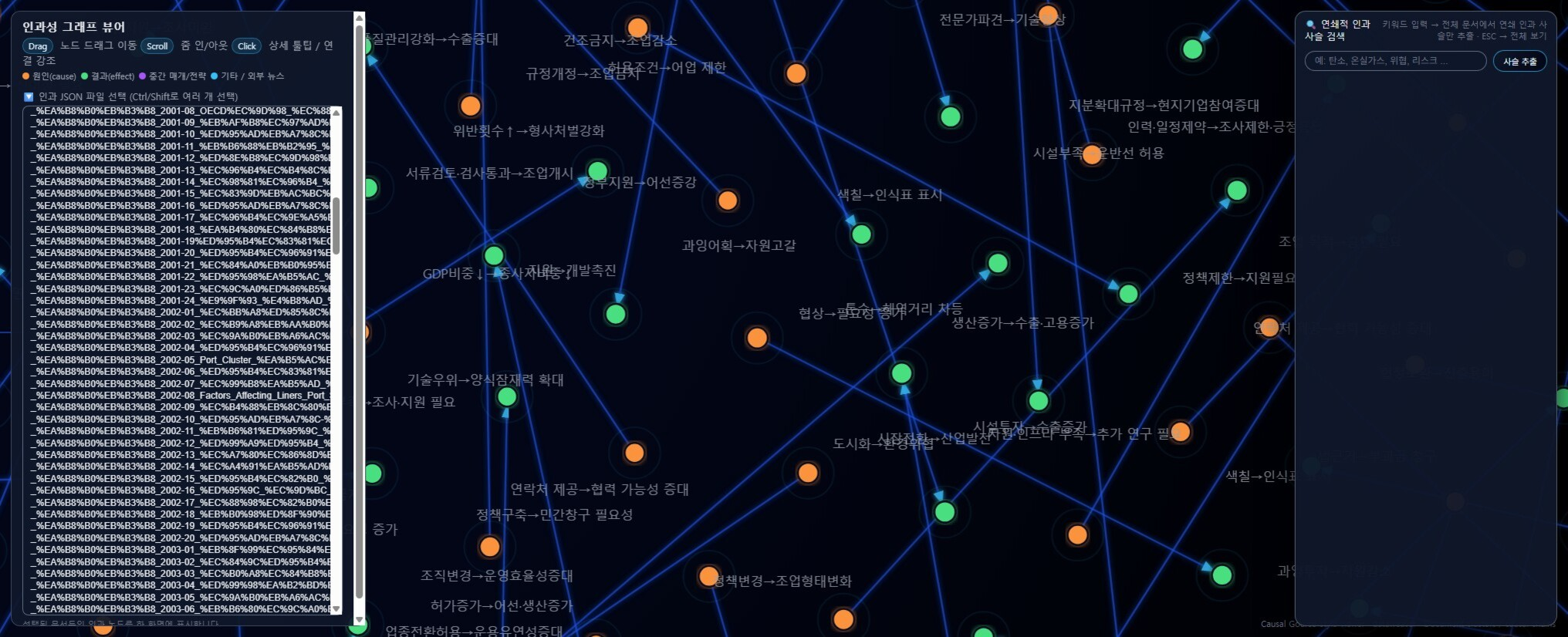 Causality RAG는 해양·수산 분야의 보고서, 연구논문, 정책자료, 뉴스 등 다양한 비정형 문서에서 인과관계 문장을 자동으로 추출하고 이를 구조화된 그래프로 시각화하는 생성형 AI 기반 분석 시스템입니다. 본 시스템은 수산자원 관리, 해양환경 변화, 탄소배출 규제, 어업·해운 정책 등 해양수산 도메인에 특화되어 있으며, 누적 25만 건 이상의 인과 문장과 35만 건 이상의 관계 데이터를 분석해 정책 수립과 전략적 의사결정에 필요한 인사이트를 제공합니다.